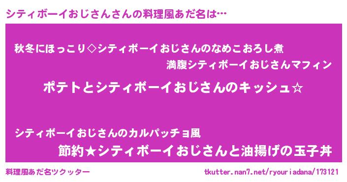 | 男性向けラノベタイトル風あだ名 | 『シティボーイおじさんの嫁は女の子じゃないと思った?』 |