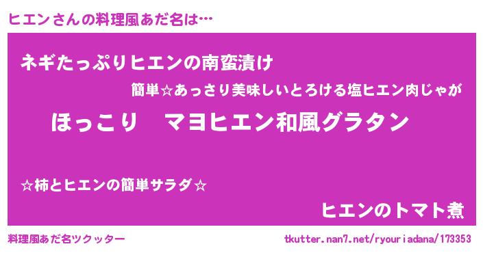 | 男性向けラノベタイトル風あだ名 | 『この素晴らしい世界にヒエンを!』 |