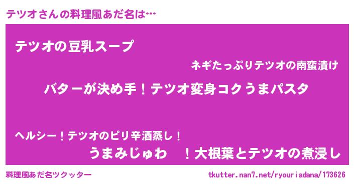 | 女子向けラノベタイトル風あだ名 | 『テツオ恋絵巻』『テツオは平凡を望む』 |