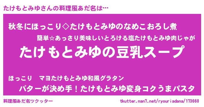 | ポケモン風あだ名 | 『ヒタケモトミユ』『タケゴンZ』 |