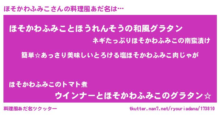 | ヘコむあだ名 | 『ほそかわふみこ(苦笑)』『なまこ酢』 |