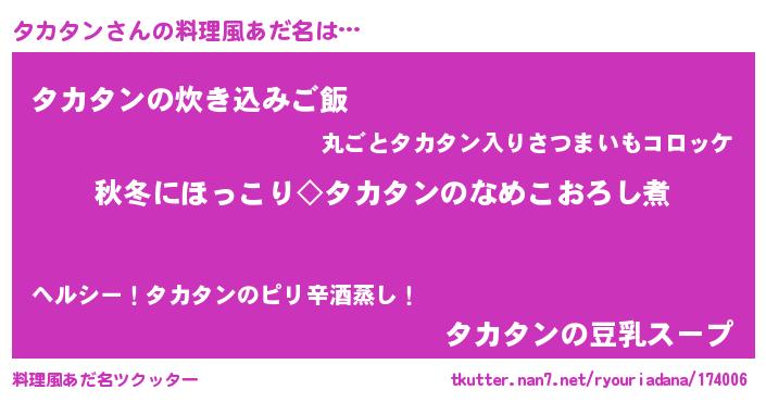 | 男性向けラノベタイトル風あだ名 | 『タカタンに滅ぼされるだけの簡単なお仕事です』 |
