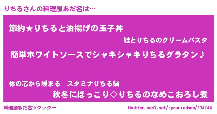 | 女子向けラノベタイトル風あだ名 | 『りちる様がみてる』『死神りちるの再婚』 |