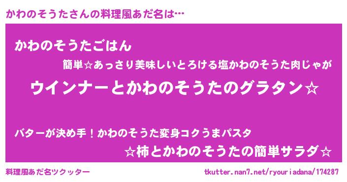 | 胡散臭い通販商品みたいなあだ名 | 『世界が平和になる高級そうな皿…その名も「かわのそうた」』 |