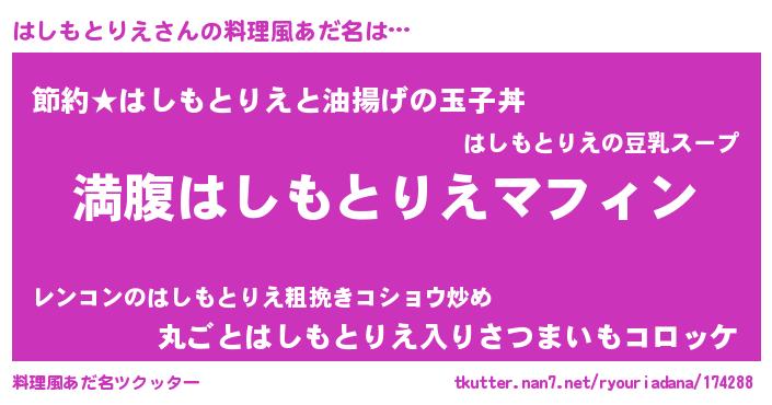 | 胡散臭い通販商品みたいなあだ名 | 『絶対に幸福をもたらす健康食品…その名も「はしもとりえ」』 |