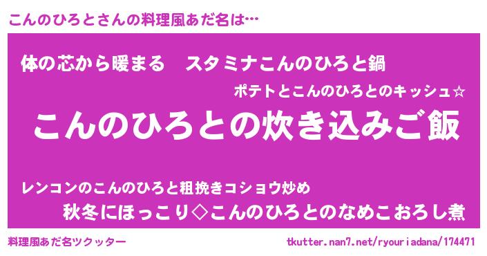 | 男性向けラノベタイトル風あだ名 | 『うちのこんのひろとが世界を掌握している!』 |