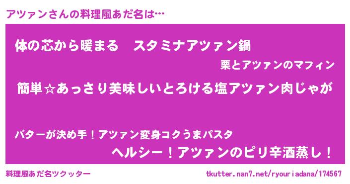 | ヘコむあだ名 | 『アツァン(笑)』『牛乳』『アツお』 |