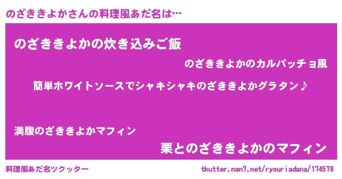 | 男性向けラノベタイトル風あだ名 | 『のざききよかの嫁は女の子じゃないと思った?』 |