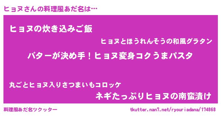 | 女子向けラノベタイトル風あだ名 | 『ヒョヌ恋絵巻』『ヒョヌの玉の輿計画!』 |