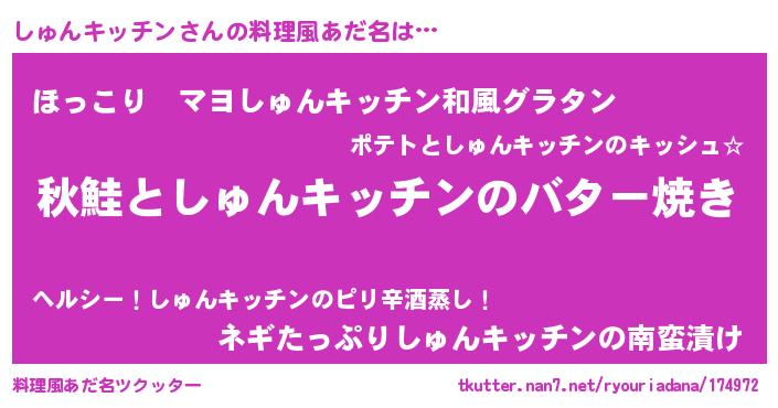 | 男性向けラノベタイトル風あだ名 | 『しゅんキッチンという概念が存在しない退屈な世界 』 |