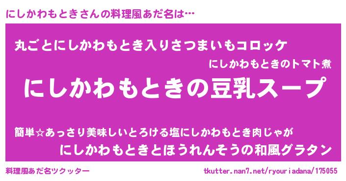 | 女子向けラノベタイトル風あだ名 | 『にしかわもときは平凡を望む』 |
