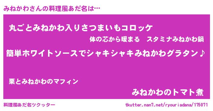 | 女子向けラノベタイトル風あだ名 | 『みねかわ様がみてる』 |