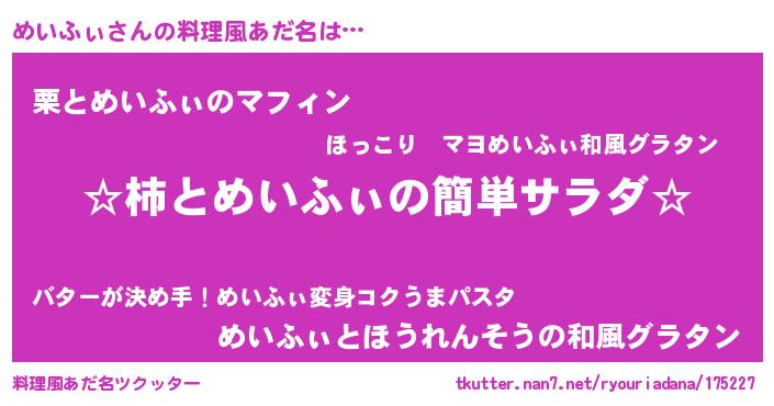 | 意味不明あだ名 | 『めかぶ科めいふぃ属』『自称めいふぃ』 |