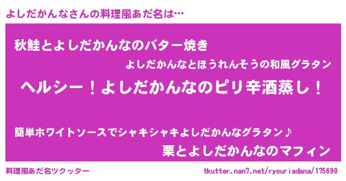 | ヒーロー風カッコイイあだ名 | 『最強戦士ヨシダカンナ』『銀牙騎士ヨシ』 |