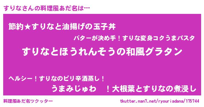| 意味不明あだ名 | 『もやし科すりな属』『ペロリンすりな』 |