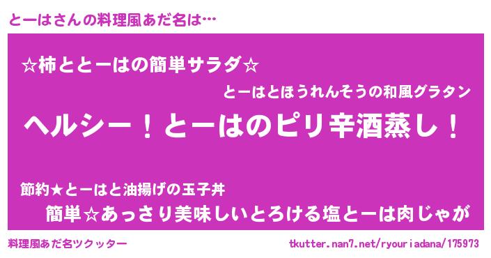 | 意味不明あだ名 | 『自称とーは』『永久保存とーは』 |