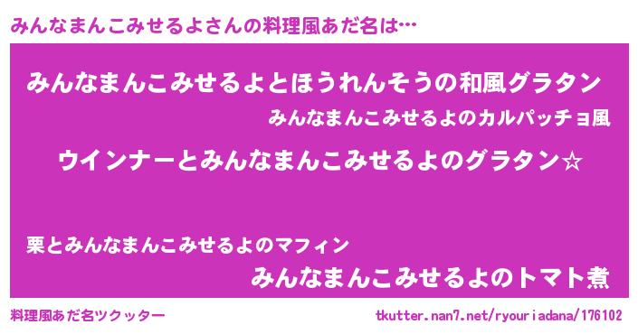 | 胡散臭い通販商品みたいなあだ名 | 『世界が平和になる高級そうな壺…その名も「みんなまんこみせるよ」』 |