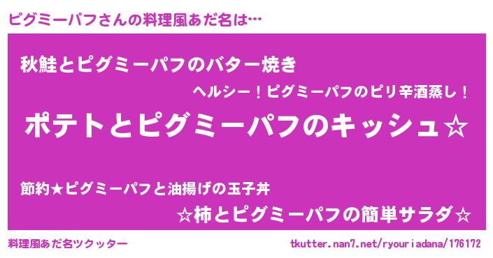 | 男性向けラノベタイトル風あだ名 | 『ダンジョンにピグミーパフを求めるのは間違っているだろうか』 |
