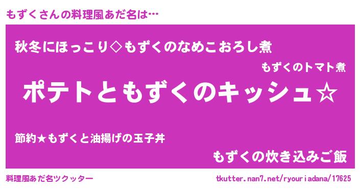 | 女子向けラノベタイトル風あだ名 | 『もずくの卵を拾いまして』 |