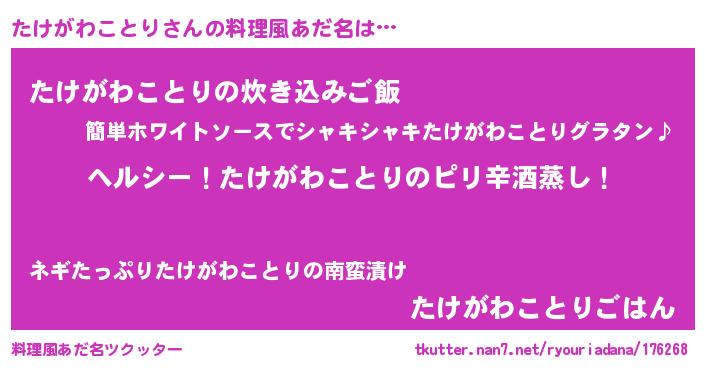 | 男性向けラノベタイトル風あだ名 | 『Re:たけがわことりから始める異世界生活』 |
