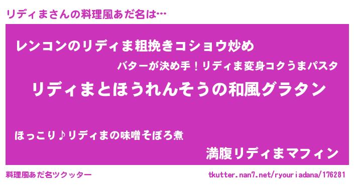 | 意味不明あだ名 | 『なめこ科リディま属』『自称リディま』 |