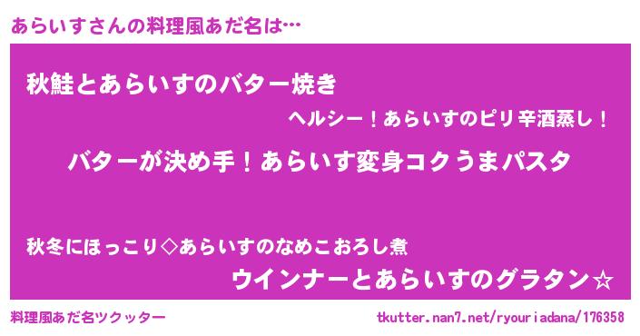 | 女子向けラノベタイトル風あだ名 | 『あらいす恋絵巻』『あらいすの契約王妃』 |