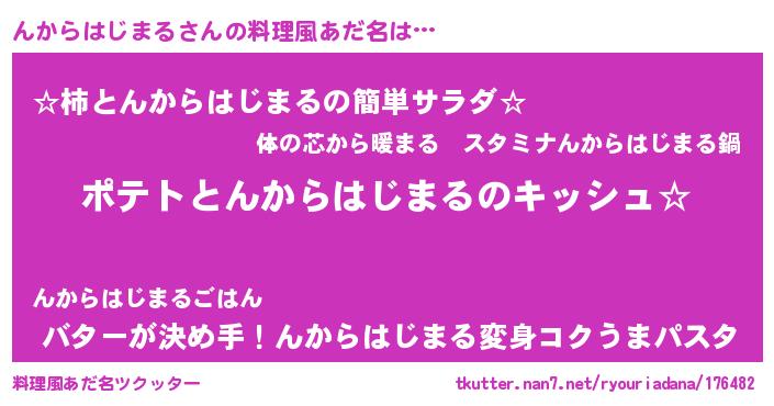 | 女子向けラノベタイトル風あだ名 | 『んからはじまるの卵を拾いまして』 |