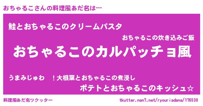 | 女子向けラノベタイトル風あだ名 | 『おちゃるこが死なない童話 林檎のおちゃるこの診療簿』 |