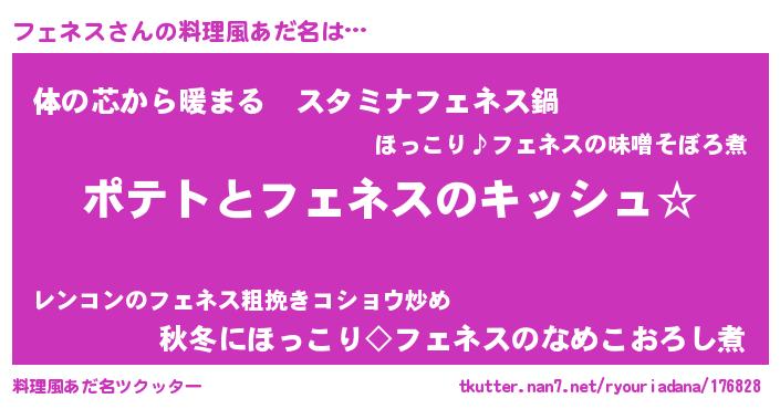 | 男性向けラノベタイトル風あだ名 | 『フェネスの嫁は女の子じゃないと思った?』 |