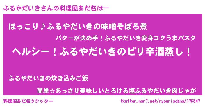 | 男性向けラノベタイトル風あだ名 | 『Re:ふるやだいきから始める異世界生活』 |