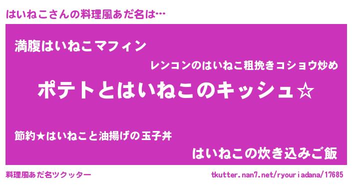 | 女子向けラノベタイトル風あだ名 | 『はいねこの卵を拾いまして』 |