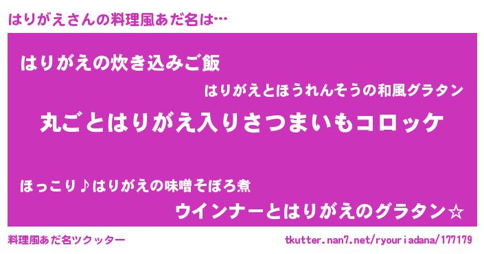 | 男性向けラノベタイトル風あだ名 | 『魔弾の王とはりがえ』『はりがえの憂鬱』 |