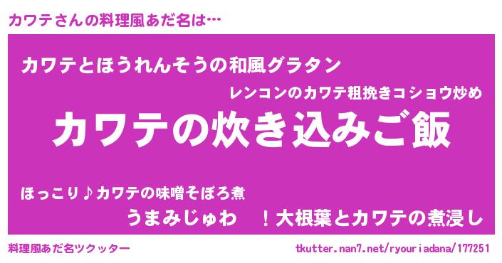 | 意味不明あだ名 | 『もやし科カワテ属』『自称カワテ』 |