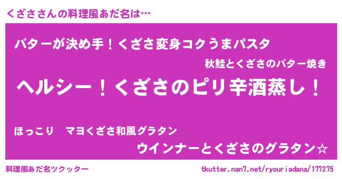 | 男性向けラノベタイトル風あだ名 | 『Re:くざさから始める異世界生活』 |