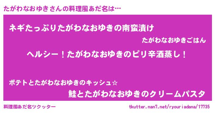 | 男性向けラノベタイトル風あだ名 | 『Re:たがわなおゆきから始める異世界生活』 |