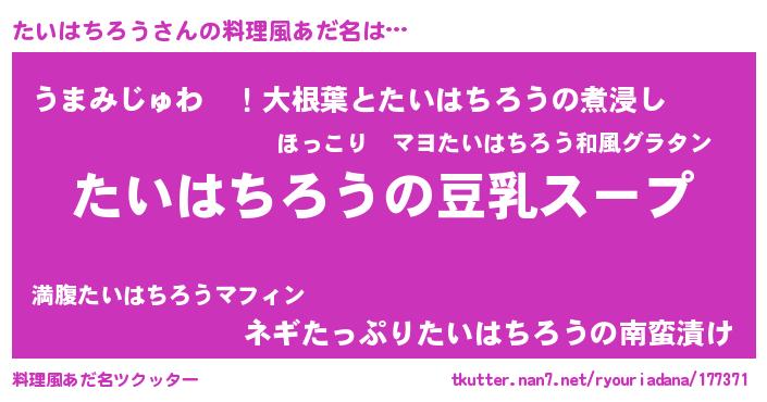 | 胡散臭い通販商品みたいなあだ名 | 『信頼と実績のサプリメント…その名も「たいはちろう」』 |