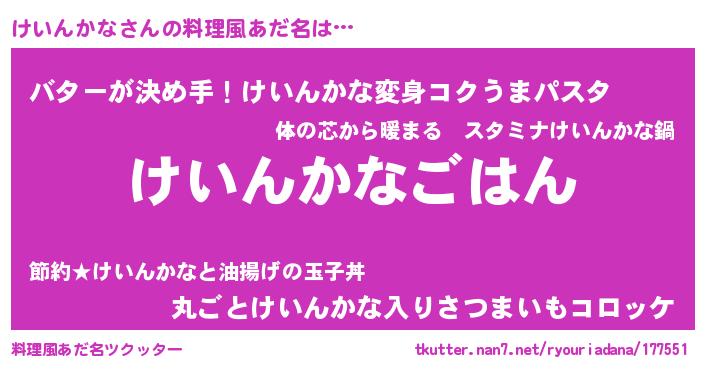 | 自動車の名前っぽいあだ名 | 『ケールスイイス』『ケンR』『ケクア』 |