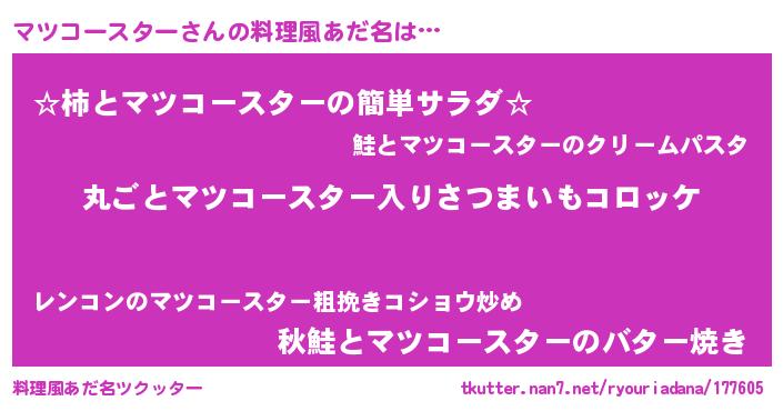 | 男性向けラノベタイトル風あだ名 | 『この素晴らしい世界にマツコースターを!』 |