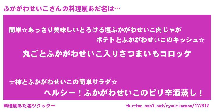 | 男性向けラノベタイトル風あだ名 | 『この素晴らしい世界にふかがわせいこを!』 |