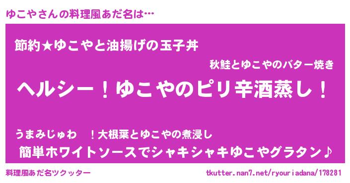 | 男性向けラノベタイトル風あだ名 | 『Re:ゆこやから始める異世界生活』 |