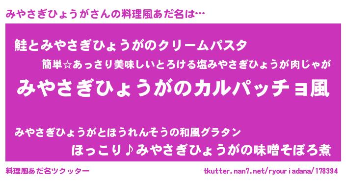 | 意味不明あだ名 | 『住所不定無職みやさぎひょうが(9歳)』 |