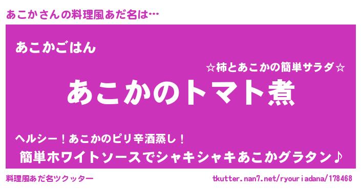 | 女子向けラノベタイトル風あだ名 | 『あこか夫妻のなれそめ』『闇のあこか』 |