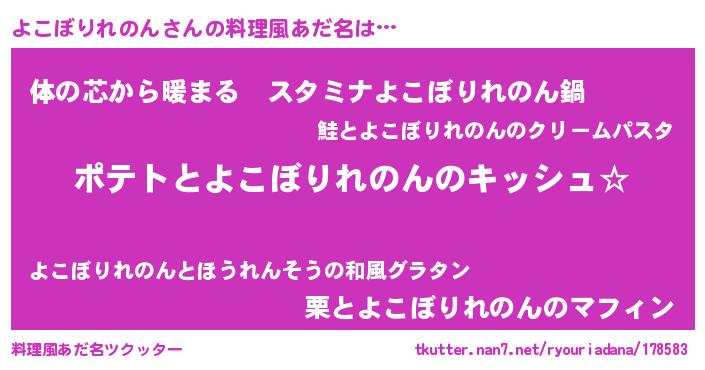 | 男性向けラノベタイトル風あだ名 | 『よこぼりれのんの嫁は女の子じゃないと思った?』 |