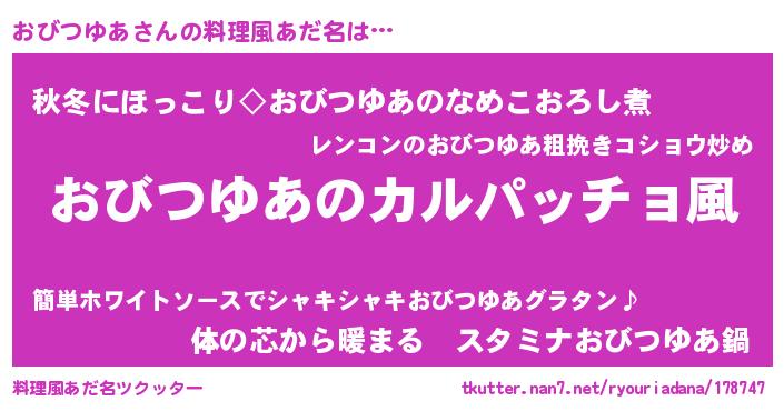 | 女子向けラノベタイトル風あだ名 | 『おびつゆあが死なない童話 林檎のおびつゆあの診療簿』 |