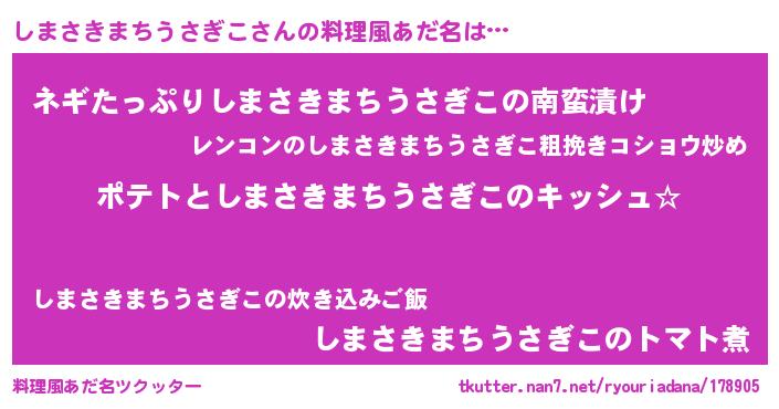 | 女子向けラノベタイトル風あだ名 | 『しまさきまちうさぎこの卵を拾いまして』 |