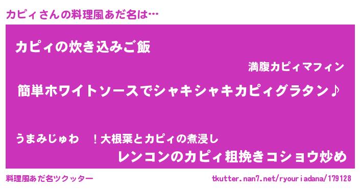 | 男性向けラノベタイトル風あだ名 | 『カピィの嫁は女の子じゃないと思った?』 |