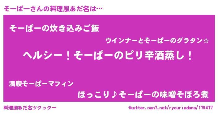 | 男性向けラノベタイトル風あだ名 | 『Re:そーぱーから始める異世界生活』 |