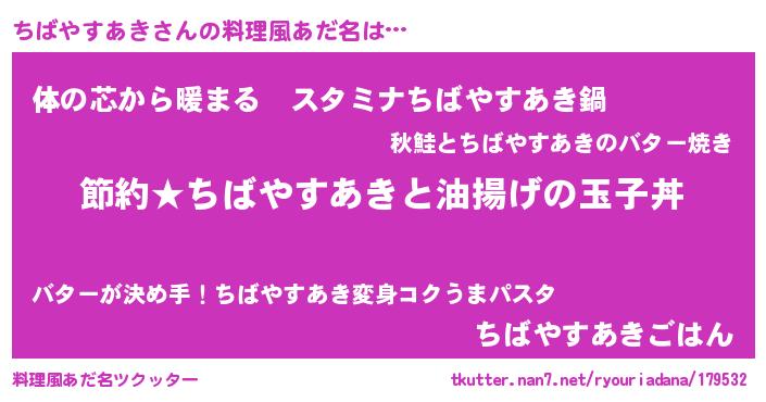 | 肩書あだ名 | 『ちばやすあきCEO』『ちばやすあき大佐』 |