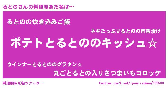 | 女子向けラノベタイトル風あだ名 | 『るとのの卵を拾いまして』 |