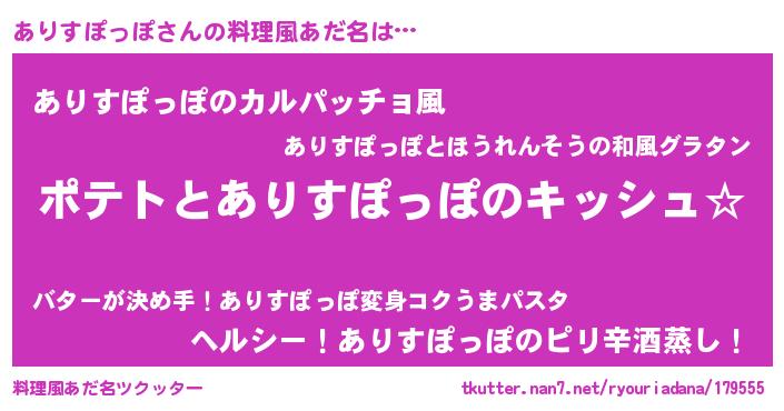 | 男性向けラノベタイトル風あだ名 | 『ダンジョンにありすぽっぽを求めるのは間違っているだろうか』 |